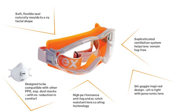 Perpaduan bahan TPE lembut yang fleksibel dan mudah dikompresikan. Tahan sobek, serta tahan terhadap abrasi dan solvent. Dikombinasikan dengan kompenen pelindung yang lebih keras untuk menjadikan pelindung mata yang dapat diandalkan terhadap benturan energi sedang, yang tidak hanya mampu menahan obyek yang bergerak dengan kecepatan 418 km/jam, tetapi juga melindungi dari droplets atau percikan cairan hingga partikel debu berukuran besar.