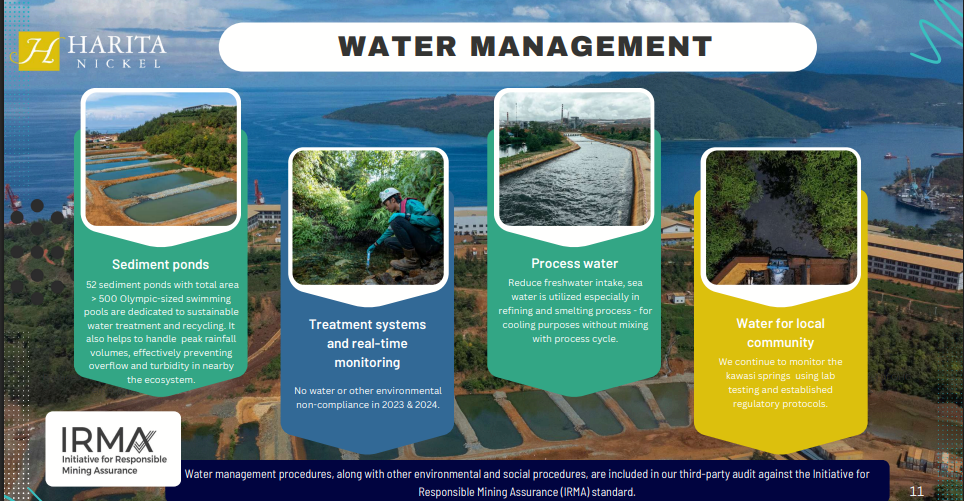 Perusahaan yang beroperasi di Pulau Obi ini, secara sukarela mengikuti audit ketat IRMA, sebuah standar internasional yang dikenal paling sulit ditembus. Prosesnya sudah dimulai sejak 2023 dan saat ini memasuki tahap II. Standar IRMA terdiri atas 26 bab yang mencakup 4 fokus area yakni Integritas Bisnis antara lain kepatuhan hukum, uji tuntas HAM. Area Tanggung Jawab Sosial meliputi hak tenaga kerja, perlindungan warisan budaya dan lainnya. Area Tanggung Jawab Lingkungan seperti pengelolaan air, emisi gas rumah kaca dan lainnya. Area keempat adalah Perencanaan Dampak Positif seperti dukungan dan manfaat bagi masyarakat dan pemukiman kembali.